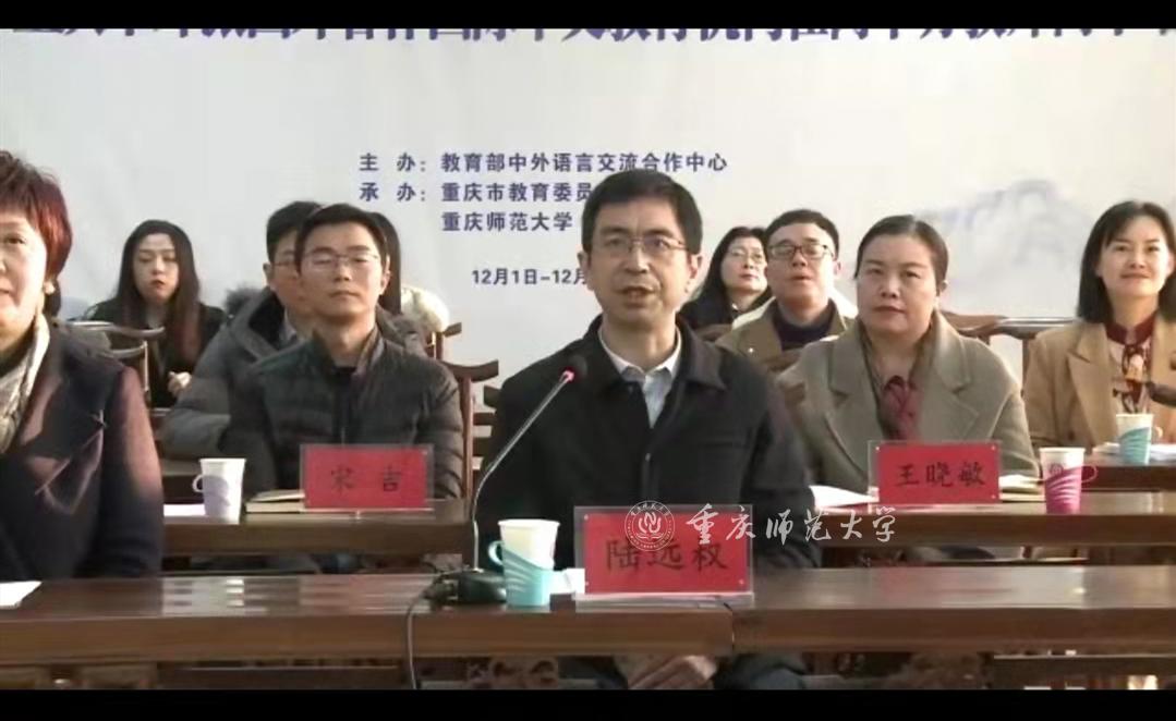 12月1日下午,2021年重庆市外派国外合作国际中文教育机构在岗中方教师岗中培训开班仪式在bat365国际汉语文化学院国际会议室顺利举行。此次培训由教育部中外语言交流合作中心主办、重庆市教育委员会及bat365官方官网承办。bat365副校长陆远权、重庆市教育委员会国际合作与交流处江燕副处长出席了本次开班仪式,相关工作人员及此次培训的35名学员在“云端”参加仪式。开班仪式由国际汉语文化学院院长张礼慧主持。