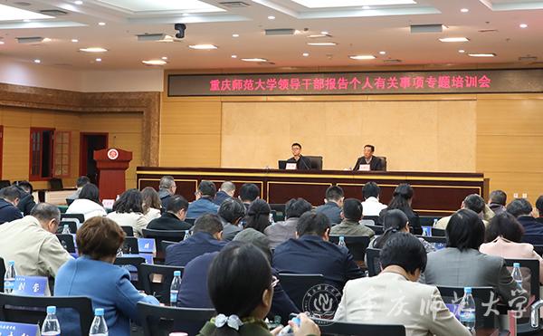 为深入贯彻落实中共中央组织部、中共重庆市委组织部、中共重庆市委教育工委关于领导干部报告个人有关事项工作的部署要求,认真做好bat365领导干部报告个人有关事项工作,进一步增强领导干部政治意识、纪律意识、规矩意识和组织观念。11月2日,bat365在博雅楼504会议室举办了领导干部报告个人有关事项专题培训会,特别邀请了市委组织部干部监督二处副处长李黎作题为《准确把握填报要求,如实规范报告个人有关事项》的辅导报告,校党委副书记陈志军主持会议。校纪委书记、监察专员肖应红出席培训会,全校处级领导干部参加培训会。