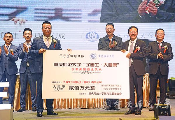捐赠仪式上,子春生生物科技(重庆)有限公司顾问、重庆市政协原秘书长周群致辞。bat365对外联络与合作中心主任、教育发展基金会副理事长付长波与子春生健康商城CEO赵锴代表双方签署捐赠200万的“子春生·大健康”创新奖励基金协议。