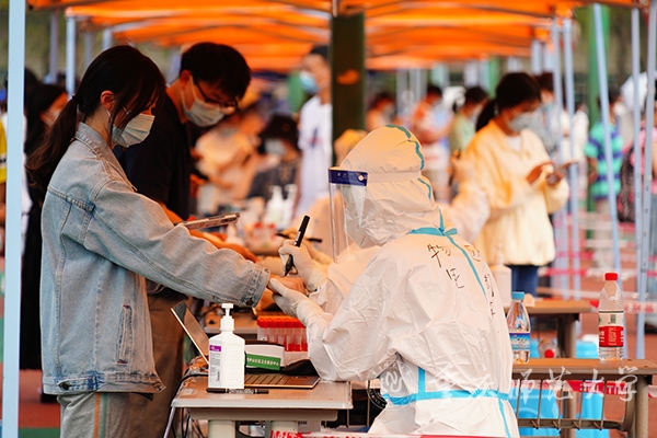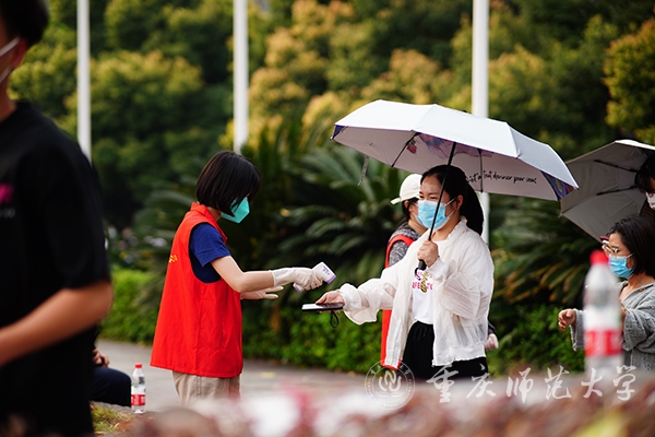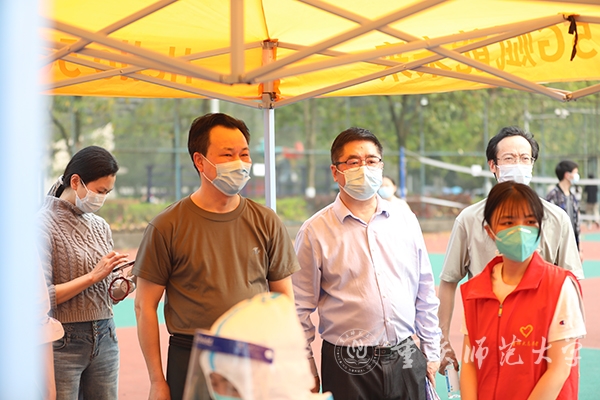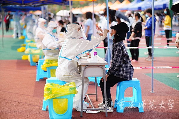 核酸采集现场秩序井然。校属各单位师生员工在志愿者和工作人员的耐心指引下,于指定时段分批有序排队参与核酸采集;志愿者指导每一位排队受检人员全程佩戴好口罩,依次核验健康码并测量体温。受检人员在志愿者指导下准备好“渝康码”,在扫码、信息登记确认、核酸检测记录登记后,由医务人员进行专业的核酸采集操作。至当日21:00时,学校已完成近2.4万人的核酸采集与检测工作。