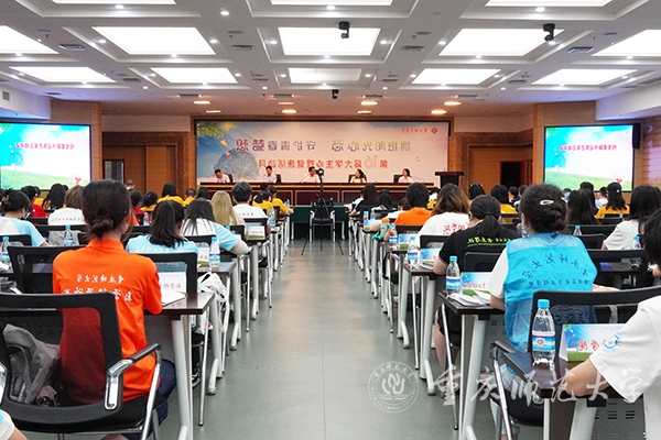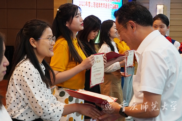 在表彰环节,校党委副书记陈志军为2021年度在心理育人工作中表现突出的师生颁发证书。心理委员代表教育科学学院尹秋月同学和二级心理工作站学院代表初等教育学院魏玲老师分别作分享发言。
