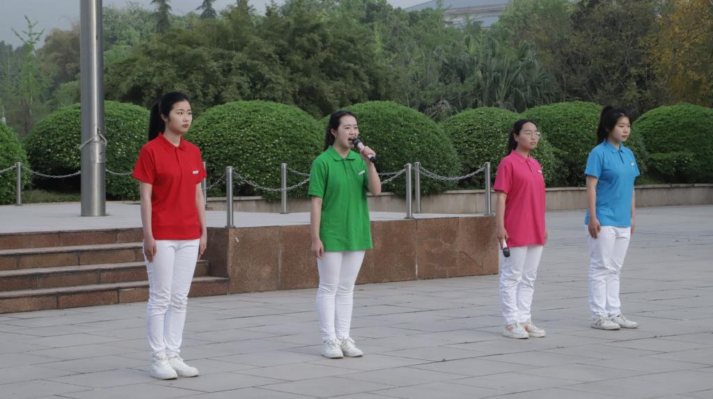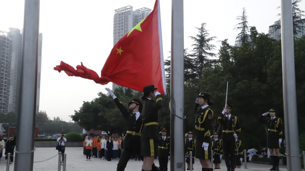 7点30分,国旗护卫队迈着整齐的步伐庄严地走向国旗台。雄壮的国歌声奏响,鲜艳的五星红旗冉冉升起,全体师生庄严肃立、行注目礼,高唱国歌、礼敬国旗,现场气氛庄严而肃穆。