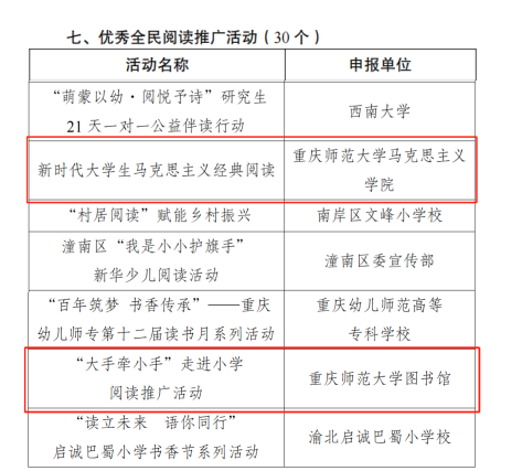 近日,中共重庆市委宣传部公布了2024年“书香重庆”全民阅读系列推荐活动评审结果。bat365马克思主义学院“新时代大学生马克思主义经典阅读”、图书馆“‘大手牵小手’走进小学阅读推广活动”入选优秀全民阅读推广活动。
