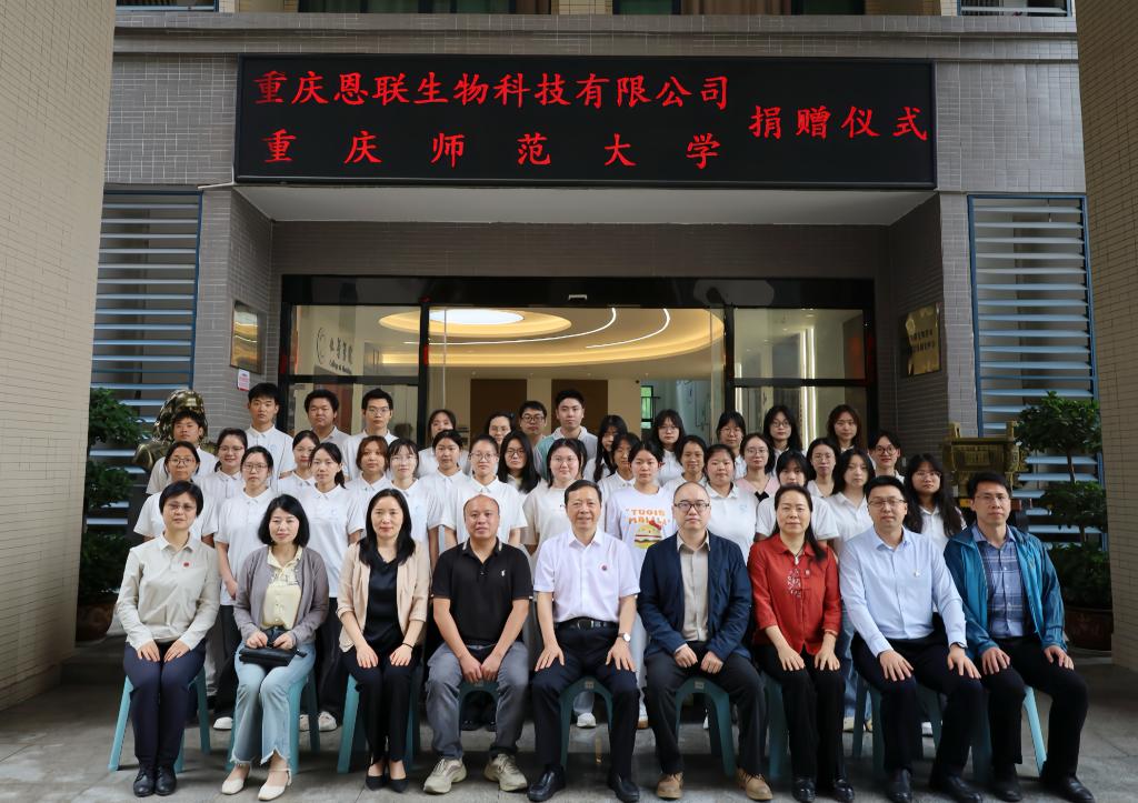 重庆恩联生物科技有限公司商务总监彭诣鑫,行政总监谭利均,化学学院党政领导班子及教师学生代表参加捐赠仪式。