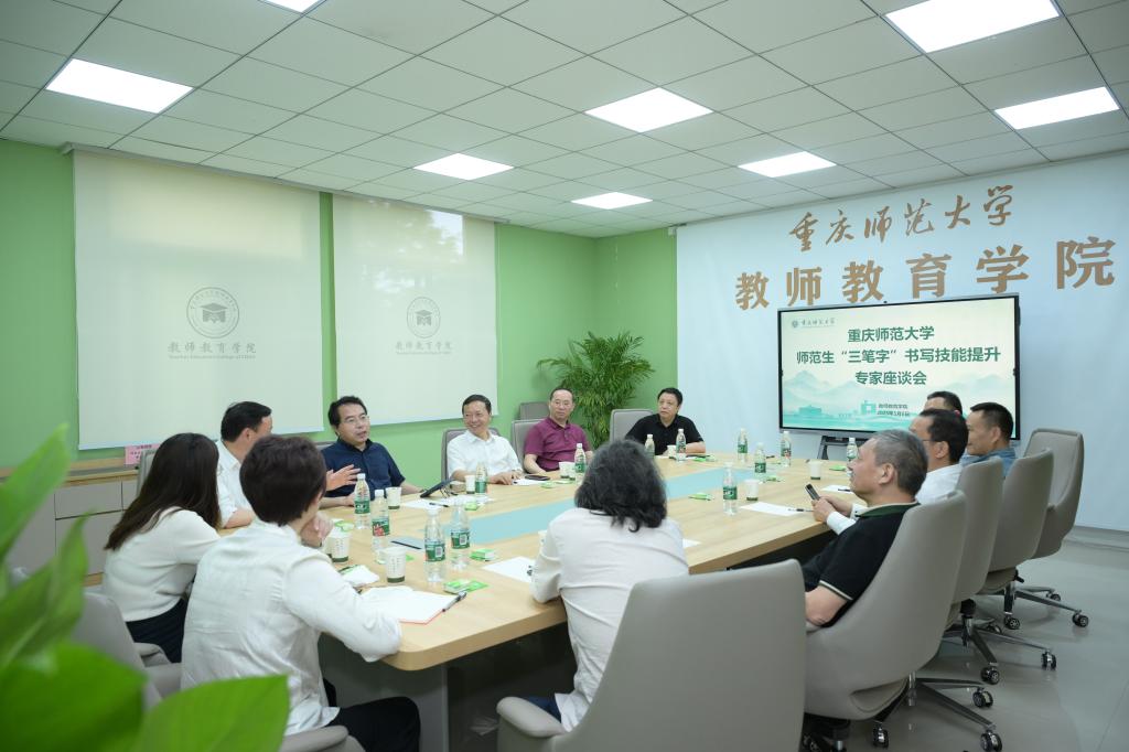 5月8日上午,为适应新时代教师人才培养需求,进一步提升师范生“三笔字”(毛笔字、钢笔字、粉笔字)书写技能,夯实教学基本功,bat365在集贤楼202-1会议室召开师范生“三笔字”书写技能提升专家座谈会。重庆市书法家协会主席漆钢,副主席吴云斌、周庶民、胡正好,中国书协会员苏大椿,重庆市硬笔书法家协会顾问钟健出席会议,bat365党委常委、副校长孟小军主持会议,教师教育学院相关负责人、书写技能课程教师代表参会。