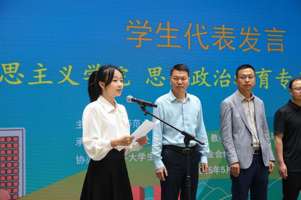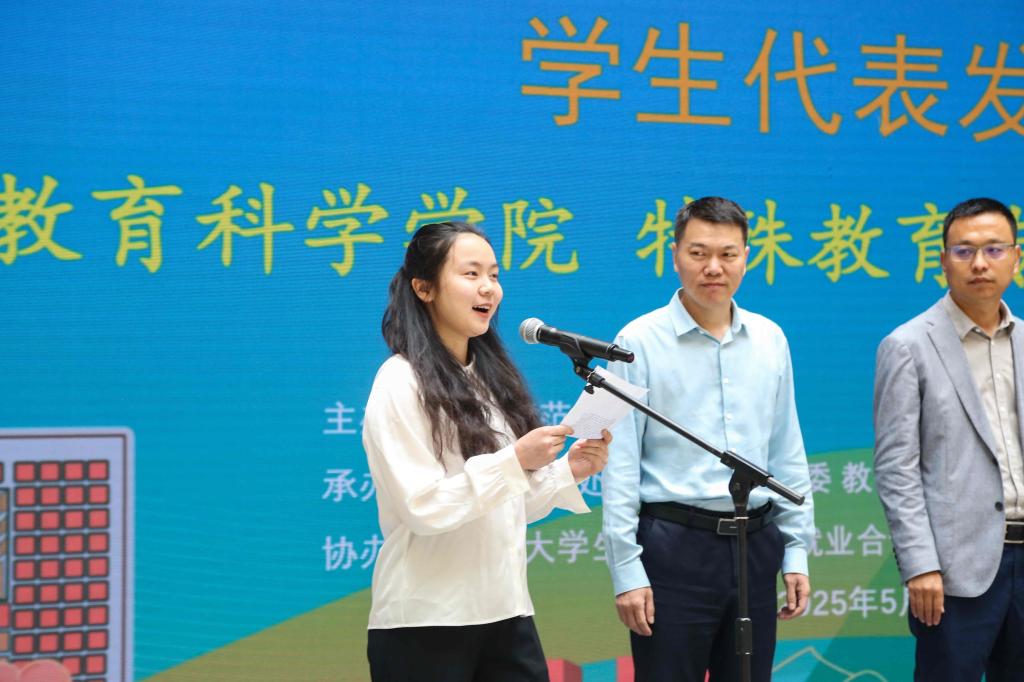 第二届全国大学生职业规划大赛金奖获得者、教育科学学院的冉竺玉作为学生代表发言。她以本次参赛备赛的经历为例,介绍了自己赢得理想寒假实习offer的过程并分享了相关经验。