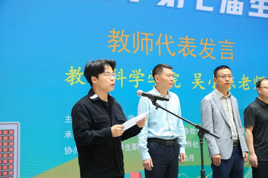 第二届全国大学生职业规划大赛金奖指导教师、教育科学学院辅导员吴小东老师作为教师代表发言。他表示,大学期间的职业生涯规划,就是要“在探索中建立人生框架,在目标中调整人生坐标”;并且鼓励同学们不仅要重视职业生涯规划,还要在不断的尝试和行动中持续优化职业生涯规划,一步步地走向更加坚定的未来。