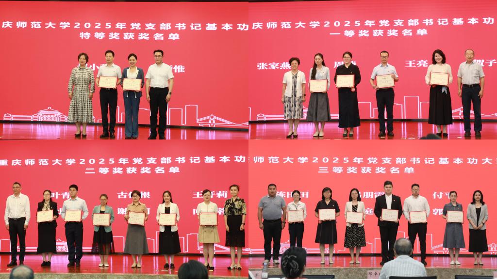 经过激烈角逐,共评选出特等奖2名、一等奖4名、二等奖6名、三等奖6名。大赛评委、中共重庆市委党校(重庆行政学院)副校(院)长罗静宣读了获奖名单,机关党委学生处支部书记胡小强、音乐学院党委教职工二支部书记汤斯惟获得特等奖,化学学院党委学生二支部书记张雨燕、外国语学院党委大学外语教工支部书记周楠、初等教育学院党委学生二支部书记王亮、新闻与传媒学院党委影视系支部书记贺子宸获得一等奖,计算机与信息科学学院党委教工二支部书记叶青、历史与社会学院党委本科生第一支部书记古佳根、马克思主义学院党委习近平新时代中国特色社会主义思想概论支部书记王开莉、教育科学学院党委第一教工支部书记刘小红、美术学院党委研究生支部书记谢汝莉、经济与管理学院党委研究生二支部书记向薪蓉获得二等奖,地理与旅游学院党委研究生三支部书记陈田田、数学科学学院党委本科生一支部书记吕朋霞、生命科学学院党委本科生支部书记付平、文学院党委学生三支部书记彭臻、体育与健康科学学院党委本科学生支部书记刘庭源、物理与电子工程学院党委教工二支部书记郭盼获得三等奖。