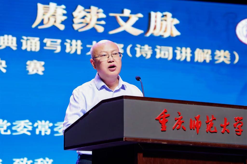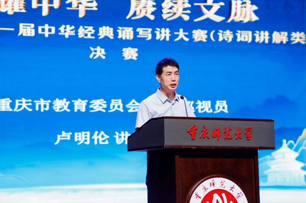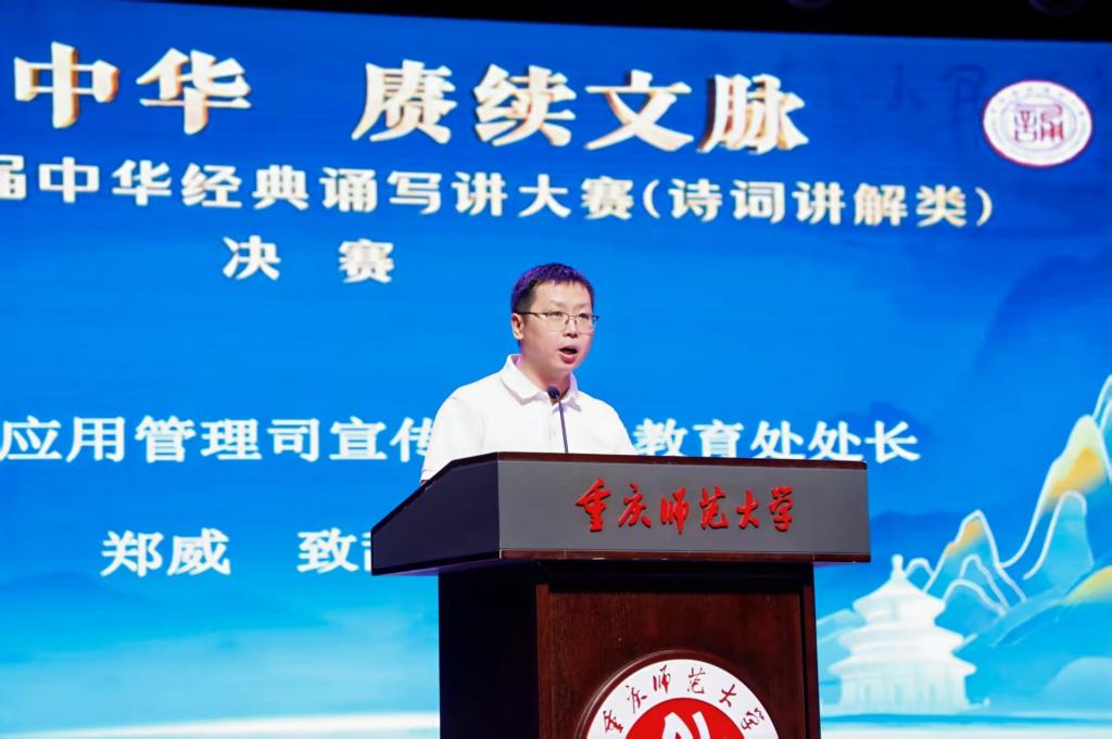 郑威传达了教育部、国家语委认真贯彻落实习近平总书记关于“要着力赓续中华文脉、推动中华优秀传统文化创造性转化和创新性发展”的重要指示批示精神。他指出,要扎实推进中华经典诵读工程,发挥语言文字以文化人、以文育人的作用和影响。他高度肯定了重庆市在国家语言文字推广基地建、 “典耀中华”系列活动、国家通用语言文字推广普及和中华优秀传统文化传承传播等方面取得的显著成绩,并预祝大赛取得圆满成功。