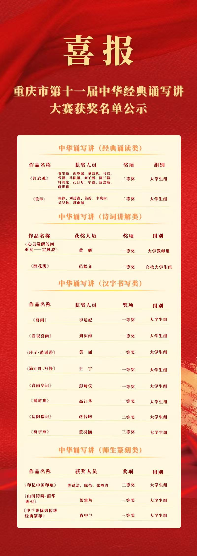 近日,重庆市第十一届中华经典诵写讲大赛圆满结束。本次大赛由重庆市教育委员会主办,大赛旨在通过诵读、讲解、书写、篆刻等多种形式,丰富习近平文化思想实践,阐发中华优秀文化价值内涵,提升广大师生和社会公众语言文化素养,激发文化自信自强。