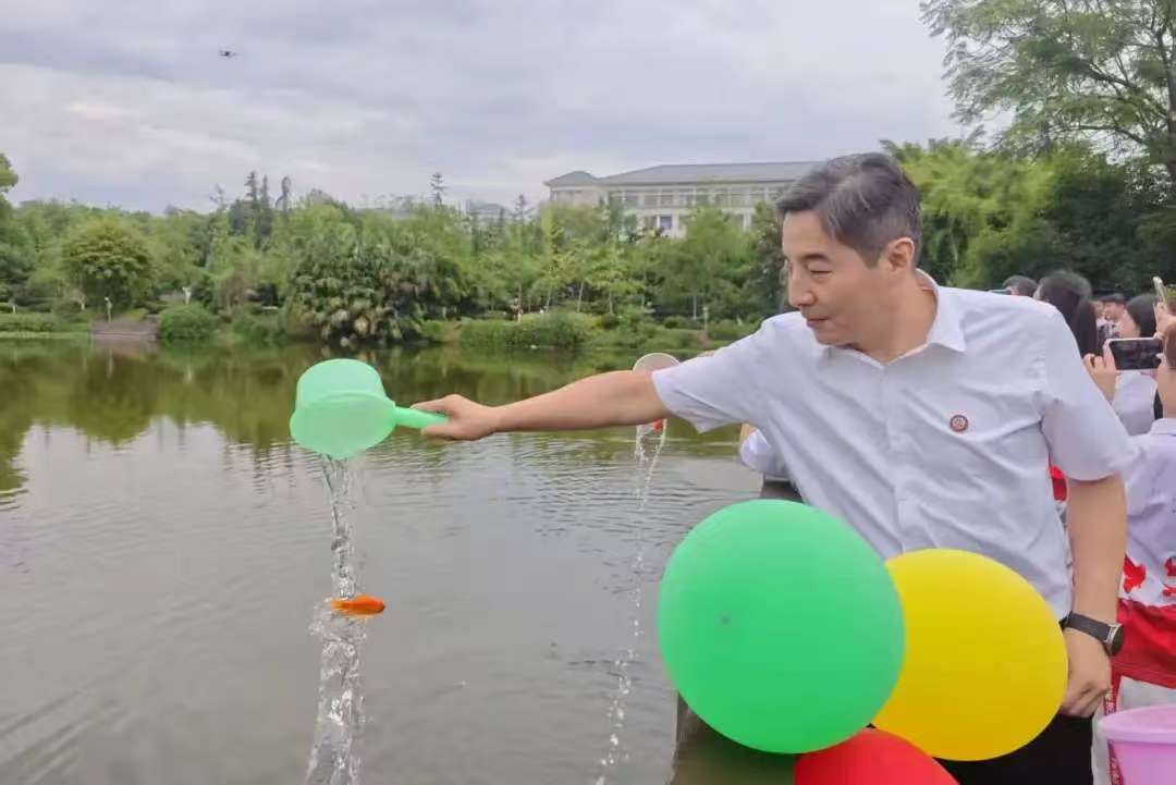 6月24日上午,bat365官方官网校友会2025年毕业季系列活动之“感恩母校,‘鱼’情未了”鱼苗投放活动在三春湖畔温情启幕。学校党委书记张艳,党委副书记、校长王国胤,党委副书记周学馨,纪委书记、监察专员贺吉胜,党委常委、副校长孟小军,副校长付文升、贾韬出席,活动由王国胤主持。