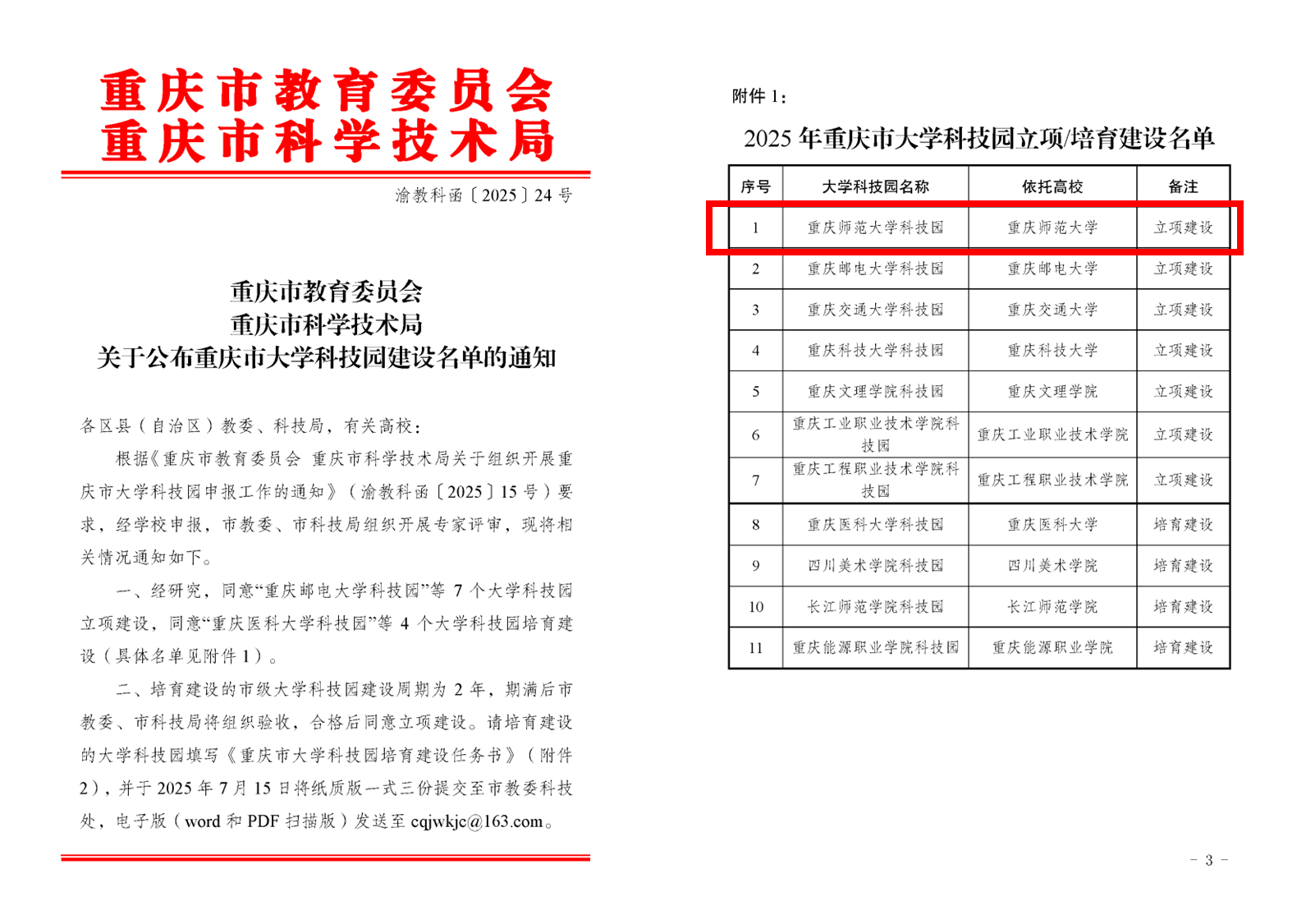 近日,重庆市教育委员会、重庆市科学技术局联合发布《关于公布重庆市大学科技园建设名单的通知》,bat365科技园正式获批为重庆市大学科技园立项建设单位。这一重要进展标志着bat365在科技创新平台建设和科技成果转化方面迈出了关键性一步,为推动"产教"融合、"科教"融汇与协同创新发展注入了新的活力。
