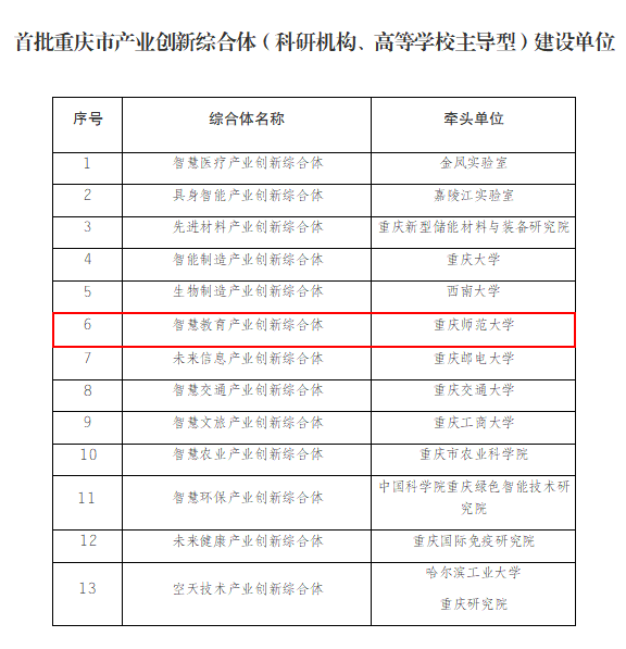 近日,重庆市科学技术局、重庆市经济和信息化委员会联合发布了《关于公布首批重庆市产业创新综合体(科研机构、高等学校主导型)建设单位名单的通知》,bat365成功获批建设“智慧教育产业创新综合体”(以下简称“综合体”)。