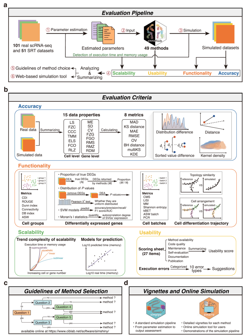 根据评估结果,团队成员还建立了方法选择的实用指南、标准数据模拟流程Simpipe和交互工具 Simsite(https://www.ciblab.net/software/Simsite/),以供用户选择合适的方法并执行模拟任务。这项研究将为单细胞组学领域的研究者提供指导和建议,帮助他们选择合适的数据模拟方法。同时,它也将激励算法开发人员提出更具扩展性和效率的方法,从而有助于研究者深刻理解和应用基因表达数据的特征。