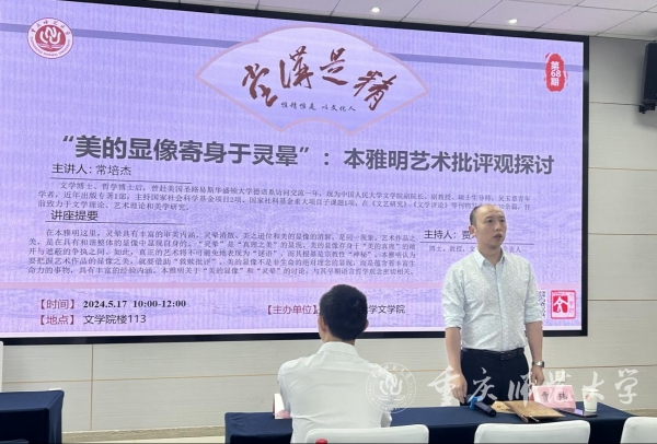 5月17日,由文学院承办的bat365官方官网70周年校庆系列学术讲座暨“精是讲堂”第68期在汇贤楼113报告厅举行。中国人民大学文学院副院长、副教授、硕士生导师常培杰应邀作题为《美的显像寄身于灵晕:本雅明艺术批评观探讨》的精彩讲座。讲座由文学院贾玮教授主持,文学院部分师生参加。