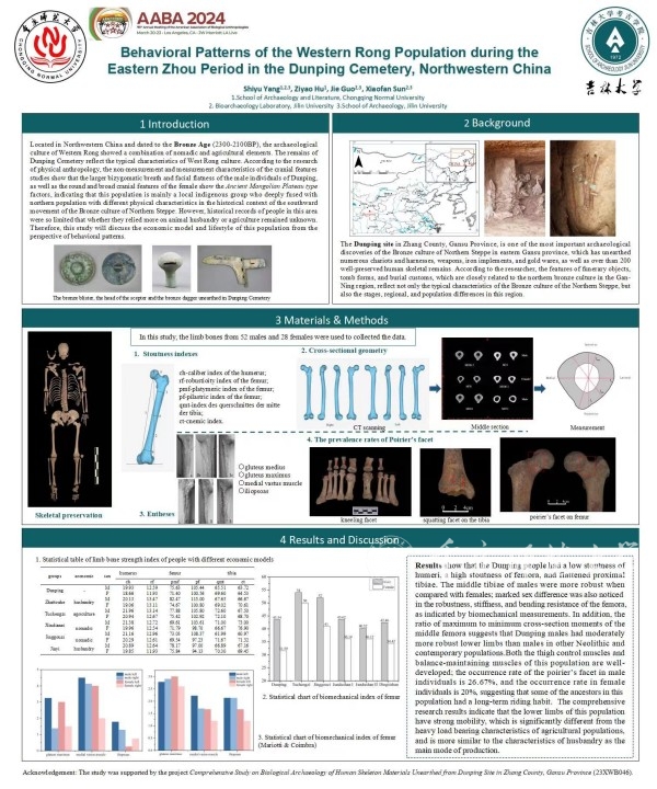 另悉,杨诗雨博士在3月20至23日还参加了第93届美国生物人类学大会,并展出题为“Behavioral Patterns of the Western Rong Population during the Eastern Zhou Period(2300-2100 BP in the Dunping Cemetery, Northwestern China”的学术海报,展示了关于甘肃漳县墩坪墓地东周时期西戎文化人群行为模式的研究成果。生物人类学是一门研究人类(包括现存人类和化石)的适应、变异和进化的科学,其研究背景建立在人类文化和行为的背景下,因此它既是一门生物学科学,也是一门社会科学。美国生物人类学学会(American Association of Biological Anthropologists,前称美国体质人类学学会)会议于1930年首次举办,从创办之始就营造了浓郁的专业学术范围,至今已经举办了93届。本次会议吸引了2200多名来自世界各地的学者共同参与,是一项具有世界影响力的国际盛会。