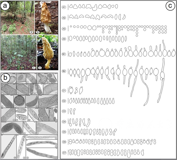 图1a:秋天羊肚菌(Morchella galilaea); 图1b:秋天羊肚菌不同形态的子囊孢子;图1c:同等比例尺下秋天羊肚菌不同形态的孢子和不同孢子萌芽方式的示意图。