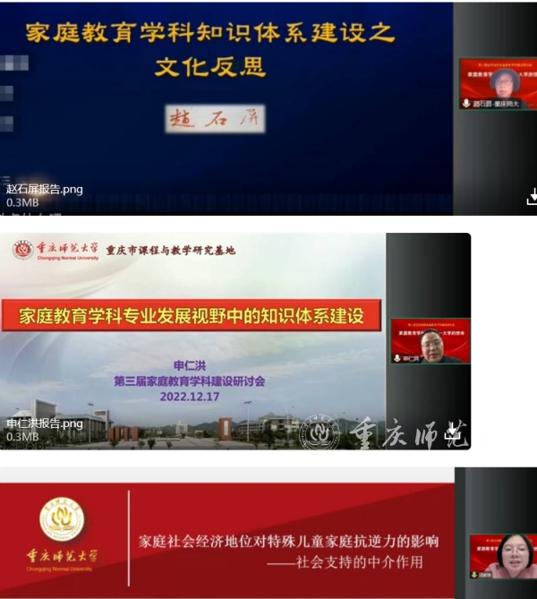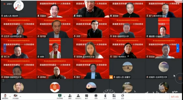 为深入学习贯彻党的二十大精神,落实《中华人民共和国家庭教育促进法》,12月17日至18日由中国高等教育学会家庭教育专业委员会(筹)主办,北京师范大学与首都师范大学共同承办的第三届全国高校家庭教育学科建设研讨会在线上举行。会议设三个分论坛,分别以“家庭教育知识和人才培养体系建设”、“家校社协同育人机制建设”、“青年学者家庭教育论坛”为主题,约2.2万名来自全国各地师生以线上形式参会互动。bat365教育科学学院教授、重庆市课程与教学研究基地主任申仁洪、赵石屏、田波琼等人参加了此次研讨会。