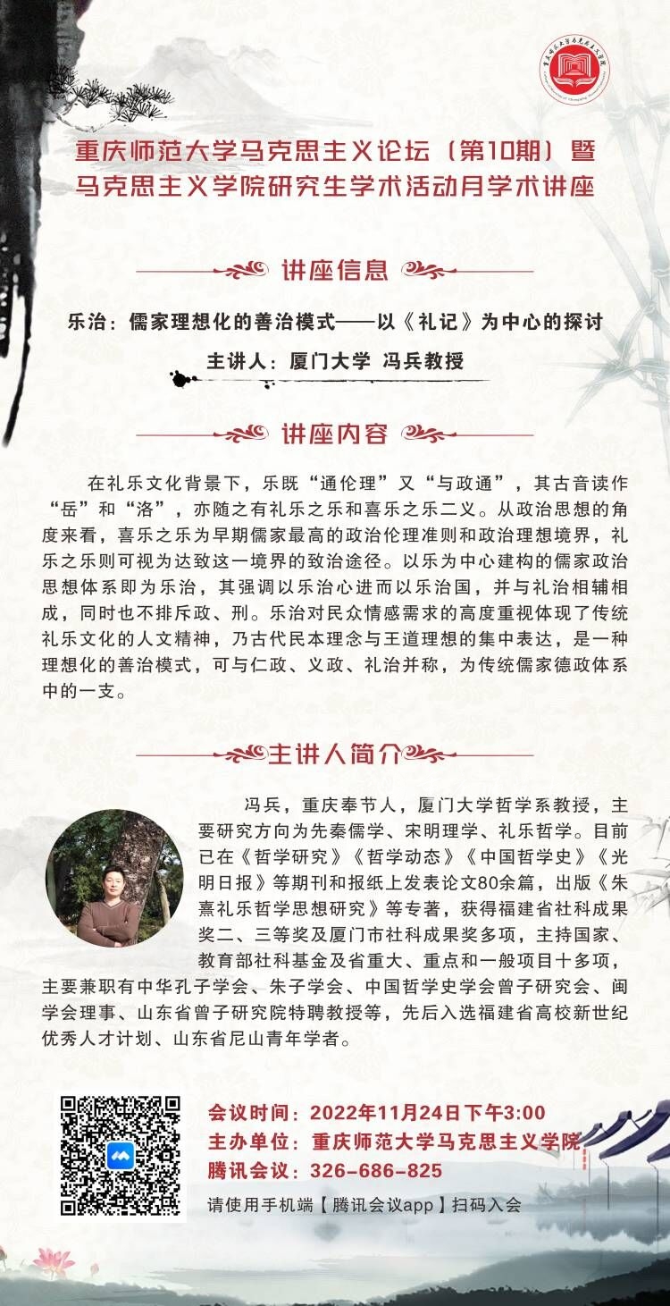 为进一步深入领略中国优秀传统文化的魅力,营造良好的学习氛围,11月24日下午,马克思主义学院2007届校友、厦门大学哲学系冯兵教授应邀为马克思主义学院师生作题为“乐治:儒家理想化的善治模式——以《乐记》为中心的探讨”的学术讲座。本次讲座系bat365官方官网马克思主义论坛(第10期)暨bat365官方官网马克思主义学院第26届研究生学术活动月系列活动,由李长泰教授主持,马克思主义学院近300名师生通过腾讯会议线上参会学习。