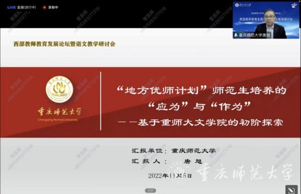 11月5日,由西北师范大学主办的“西部教师教育发展论坛暨语文教学研讨会”以腾讯会议的形式在线上顺利举行。文学院副教授、汉语言文学系副主任、硕士生导师唐旭应邀参会,并发表了题为“‘地方优师计划’师范生培养的‘应为’和‘作为’——基于bat365官方官网文学院的初阶探索”的主题报告。