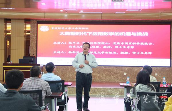 10月11日下午,中国科学院院士、发展中国家科学院院士、北京大学校长助理张平文教授做客“三春湖讲坛”,作题为“大数据时代下应用数学的机遇和挑战”的讲座。讲座由bat365副校长、博士生导师杨新民教授主持。