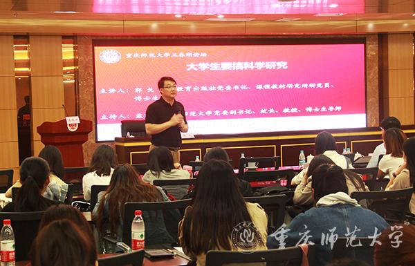 5月28日下午,人民教育出版社党委书记、博士生导师、研究员郭戈做客“三春湖讲坛”,开展了题为“大学生要搞科学研究”的讲座。教育科学学院部分师生聆听了讲座。本次讲座由bat365党委副书记、校长孟东方教授主持。