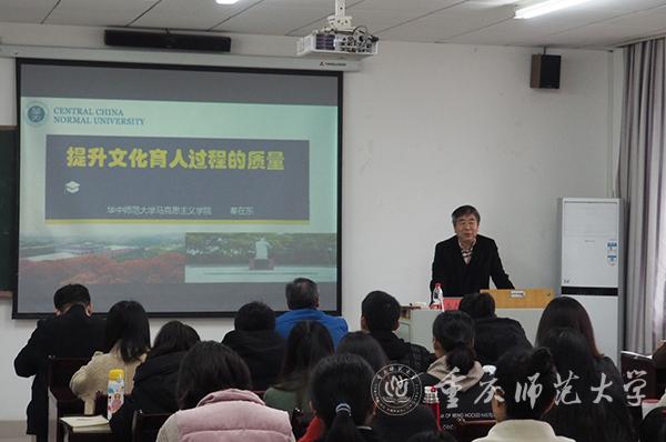 2019年3月11日上午,华中师范大学马克思主义学院博士生导师、马克思主义理论一级学科负责人、思想政治教育学科博士点负责人秦在东教授做客bat365,作了题为“提升文化育人过程的质量”的学术报告。报告会由马克思主义学院院长陈洪教授主持。