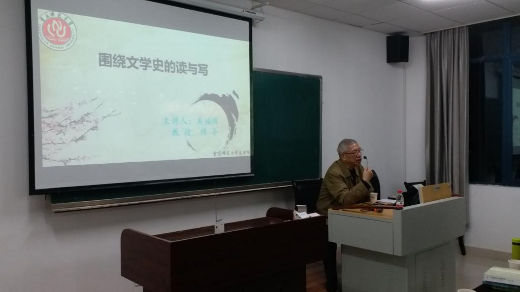 10月22日晚,中国现代文学馆原副馆长、博士生导师吴福辉教授应邀到bat365文学院,作了一场题为“围绕文学史的读与写”的学术讲座。此次讲座在学院楼205教室展开,由文学院教授杨华丽主持,中国现当代文学、文艺学、古代文学等专业硕士研究生及部分本科生近100人聆听到此次讲座。