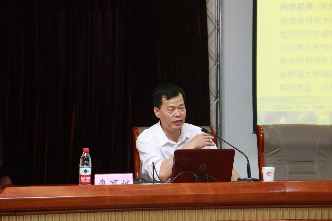 廖教授简要介绍了徐渭绘画艺术与文学成就,指出其诗歌艺术一直评价较低的现象。廖教授运用黑格尔对于古典哲学的相关理论阐释了文学艺术本质和人的精神的关系,提出了徐渭诗歌的“非古典”特征论断。