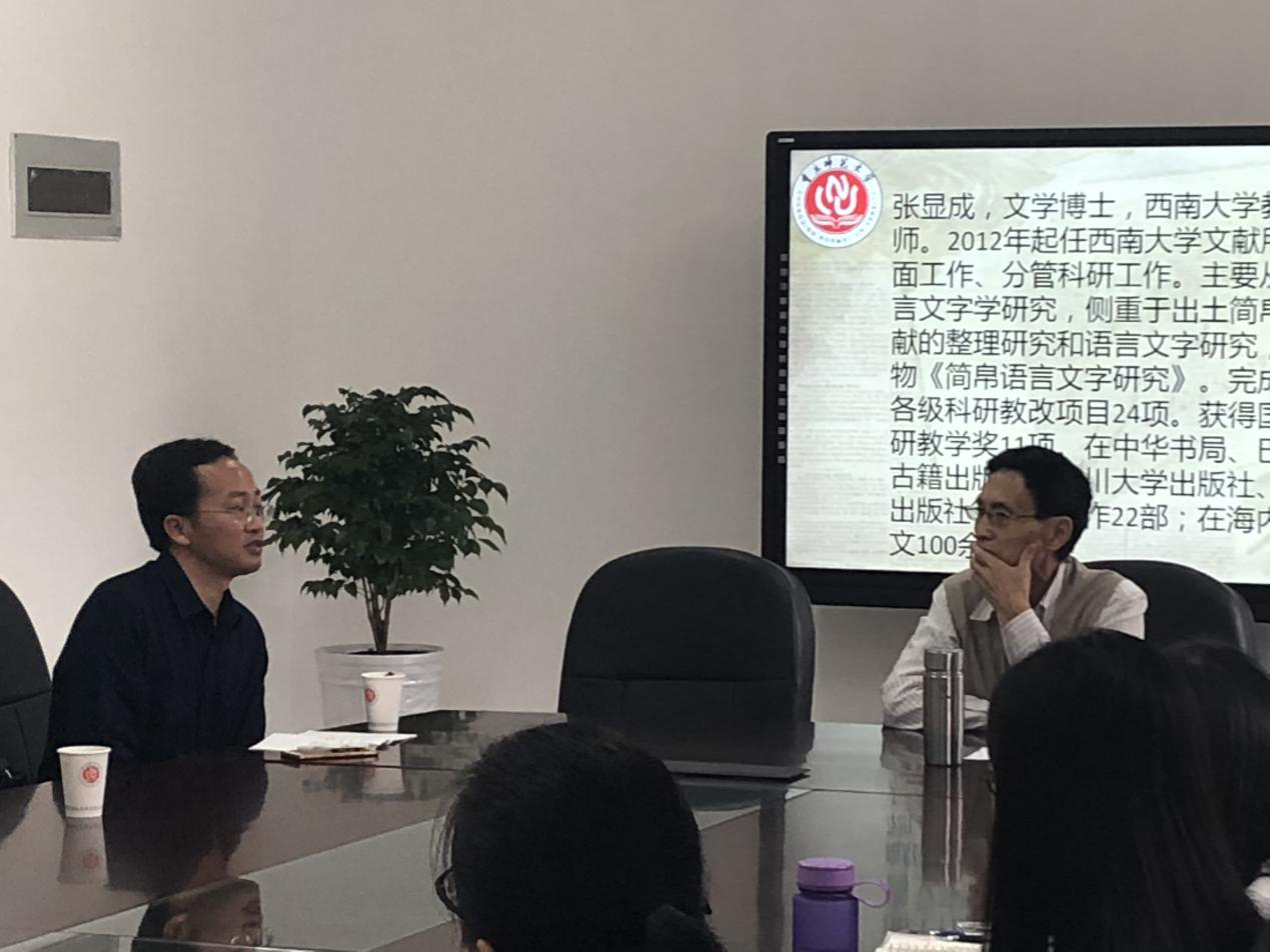 9月29日下午,西南大学教授、博士生导师张显成在bat365汇贤楼文学院406室为语言文字学专业研究生做了题为“谈语言学与文献学的材料和方法问题”的学术讲座。讲座由文学院教授朱怀主持。