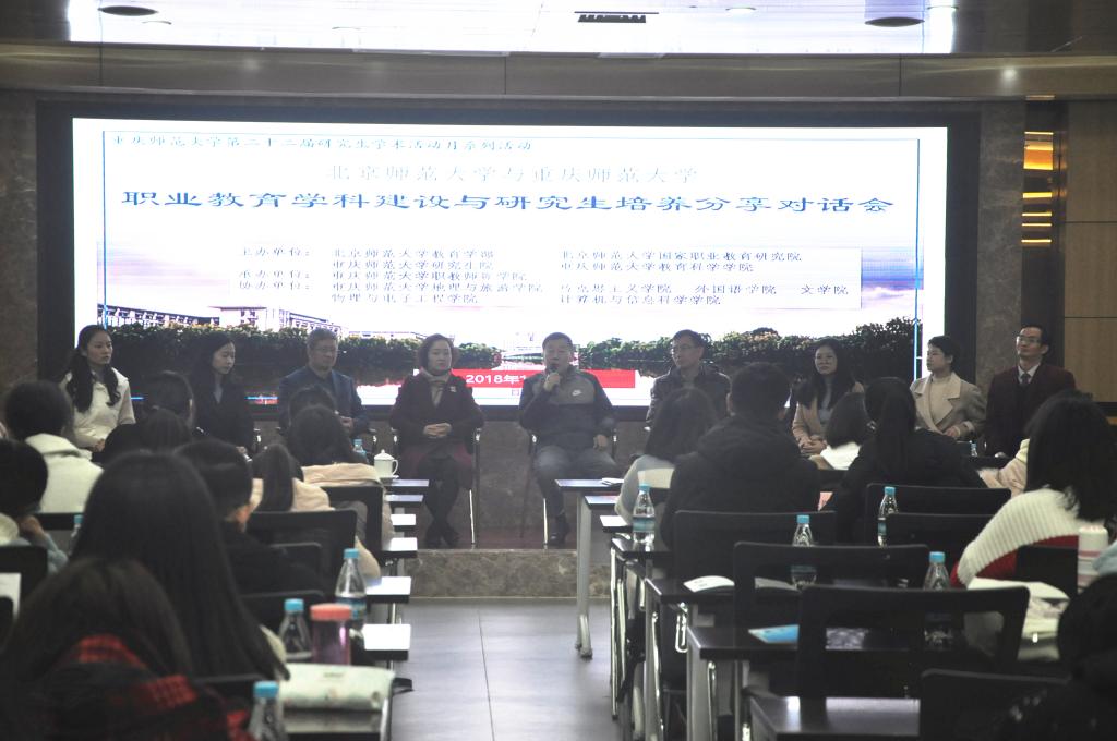 bat365职教师资学院副院长南海教授汇报了bat365职业教育学科建设发展的历程以及职业教育研究生培养的情况。接着,两校学生代表就考研、学习、生活、教育科研等方面的经验进行了交流分享。职教学院兼职导师、重庆城市管理职业学院国际交流处处长吕红等导师做了精彩分享和指导。