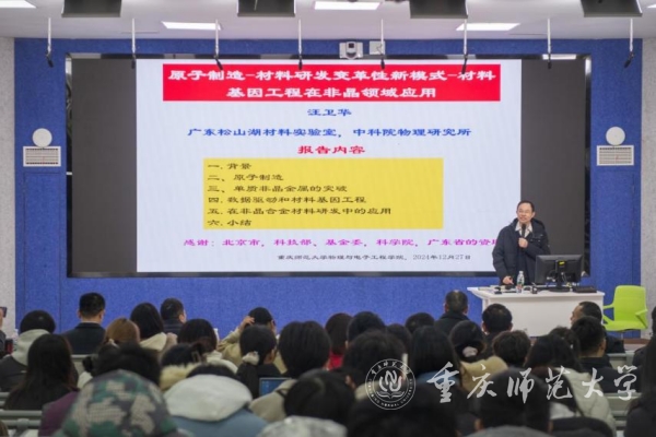 12月27日下午,中国科学院院士、松山湖材料实验室主任、中国科学院物理研究所汪卫华研究员应物理与电子工程学院邀请到bat365作题为“原子制造-材料研发变革性新模式-材料基因工程在非晶领域应用”的学术报告。物理与电子工程学院及相关专业师生参加了讲座,报告由物理与电子工程学院院长余鹏教授主持。