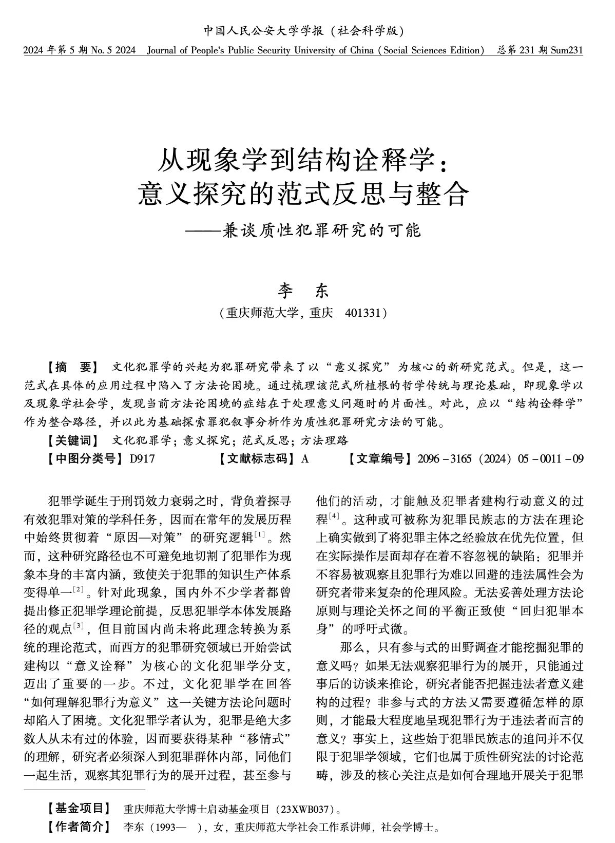 近日,bat365历史与社会学院社会工作系教师李东博士在国内公安与犯罪领域权威期刊《中国人民公安大学学报(社会科学版)》以独立作者身份发表《从现象学到结构诠释学:意义探究的范式反思与整合——兼谈质性犯罪研究的可能》一文。