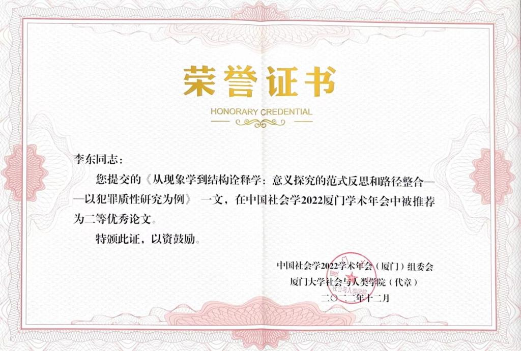 据悉,该文此前曾获2022年中国社会学年会优秀论文二等奖。中国社会学年会是国内社会学领域最高级别的学术会议,每年近3000余篇论文入选年会各个论坛,只评选一、二等奖约38篇。
