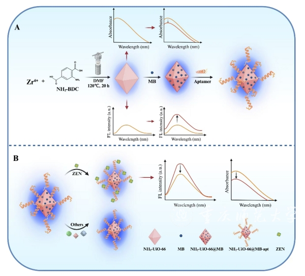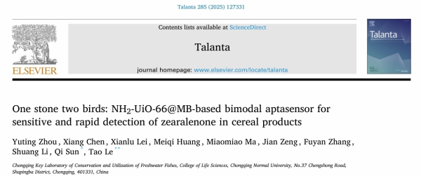 近日,bat365生命科学学院动物健康与食品安全创新团队,依托重庆市“十四五”农业重点学科、重庆市食品质量与安全快速检测协同创新中心、淡水鱼类资源保护与利用重庆市重点实验室等科研平台,在真菌毒素检测领域取得了重要进展。该团队的研究成果以“One stone two birds: NH2-UiO-66@MB-based bimodal aptasensor for sensitive and rapid detection of zearalenone in cereal products”为题在中国科学院一区Top期刊《Talanta》上在线发表。论文的第一作者为bat3652022级食品加工与安全专业硕士研究生周玉婷,通讯作者为生命科学学院的乐涛教授、孙琦副教授。