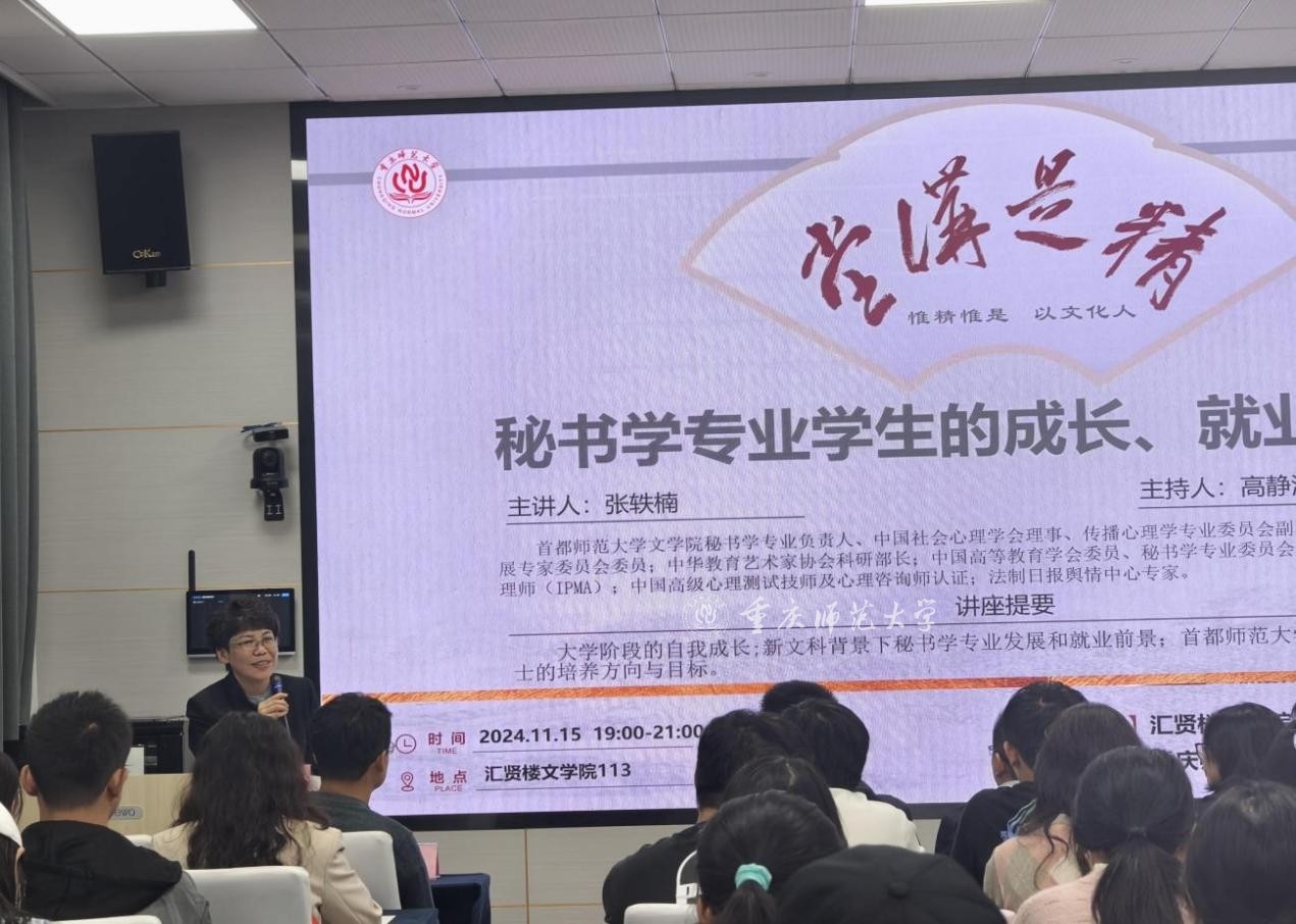 11月15日,文学院“精是讲堂”第108期在汇贤楼113会议室报告厅举行。讲座特邀首都师范大学文学院秘书学专业学科负责人张轶楠副教授作题为《秘书学专业学生的成长、就业与考研》的讲座。文学院师生代表到场聆听。文学院秘书学系主任高静波主持讲座。