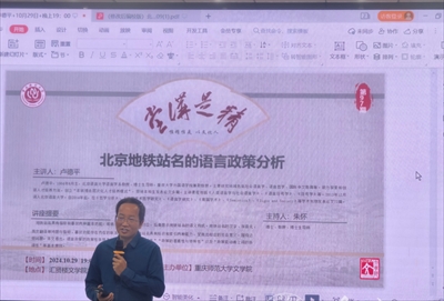 卢德平教授强调,做学术研究要关注社会问题,不能只以书本为本。正因如此,他选择了“接地气”的研究对象——北京地铁站名的变迁及其语言政策分析,阐释语言政策在实际空间中的转化路径与规律。卢德平教授表示,地铁站名不仅具有指称和摹状两种基本功能,前者直接对应地铁空间,后者则展现了地铁站名的语义构成。地铁站名的汉字、拼音、英文翻译等元素,与这两种功能之间存在着千丝万缕的联系。同时,地铁站名还具备标识和索引两种能力,它们不仅指向具体的地理位置,更承载着丰富的社会意义和文化价值。在探讨地铁站名语言政策的过程中,卢德平教授强调稳定性与灵活性、普遍性与特殊性以及政策能动者之间的协调性等基本原则。他认为,这些原则对于语言政策干预公共空间的语言实践具有指导意义,有助于确保语言政策的科学性和有效性。