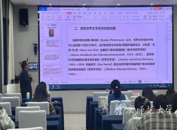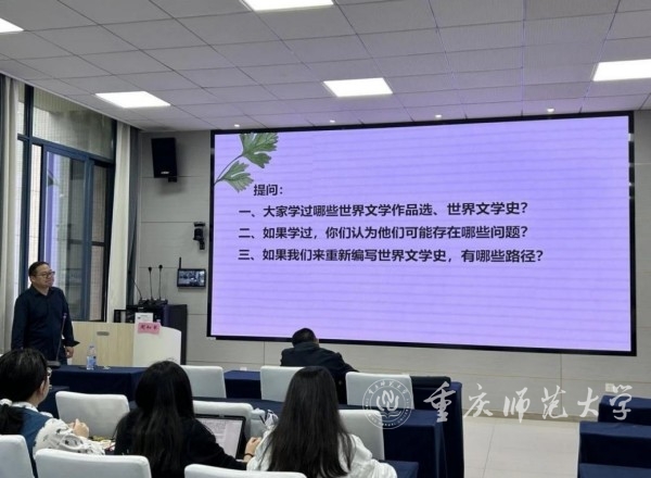 10月25日,文学院“精是讲堂”第93期在汇贤楼113报告厅举行。天津外国语大学周和军教授受邀作题为《世界文学史存在的问题与重写路径》的讲座。讲座由重庆市抗战文史研究基地副主任熊飞宇主持,文学院硕士研究生到场聆听。