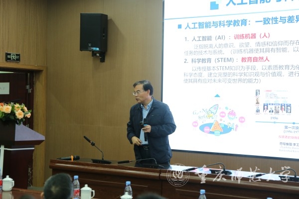 徐宗本教授首先分析了教育自然人与训练机器(人)的现状,引导学生正确认识这二者的一致性和差异性,从而有助于预判人工智能未来的发展方向和科学教育未来的聚力点。随后,他阐述了科学教育当下所面临的前所未有的机遇:“人机协同”和“重定位”。徐宗本教授介绍了人工智能时代科学教育应有的定位、目标、内涵与教育教学方法的改革着力点,重点阐述了“为创新而教、为能力而教、为质效而教”的教育理念,以“大学科、大场景、大观念”为核心的教育内涵,以及“以问题为中心”的教育教学方法。