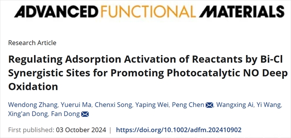 10月3日,bat365化学学院师生关于环境污染治理的最新研究成果《Regulating adsorption activation of reactants by Bi-Cl synergistic sites for promoting photocatalytic NO deep oxidation》被国际顶级期刊《Advanced Functional Material》(SCI一区,TOP期刊,IF=18.5)在线发表。学校科研处张文东副研究员为第一作者,化学学院硕士研究生马悦芮为共同第一作者,陈鹏博士为第一通讯作者。