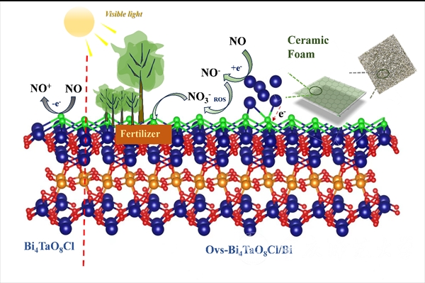 为了解决这一关键科学问题,研究人员通过在Bi4TaO8Cl的表面原位构筑Bi单质和氧缺陷设计合成了高性能环保材料及器件。该研究采用原位手段揭示了NO+和NO-离子对光催化氧化NO的反应路径影响,为污染分子净化路径的调控提供良好借鉴。重要的是,该材料及器件在室温下对环境污染物表现出了高效的净化效果:一是对空气中的一氧化氮(NO,浓度为600ppb)去除率高达89%,有效抑制了二次污染物二氧化氮(NO2)的生成,同时表现出良好的稳定性;二是对致癌空气污染物甲醛(浓度为60ppm)的去除率高达75%;三是对大肠杆菌和葡萄球菌的杀灭率可达100%。该研究成果对研发高性能环保材料及器件提供了良好参考,在环境污染治理领域表现出了良好的应用前景。