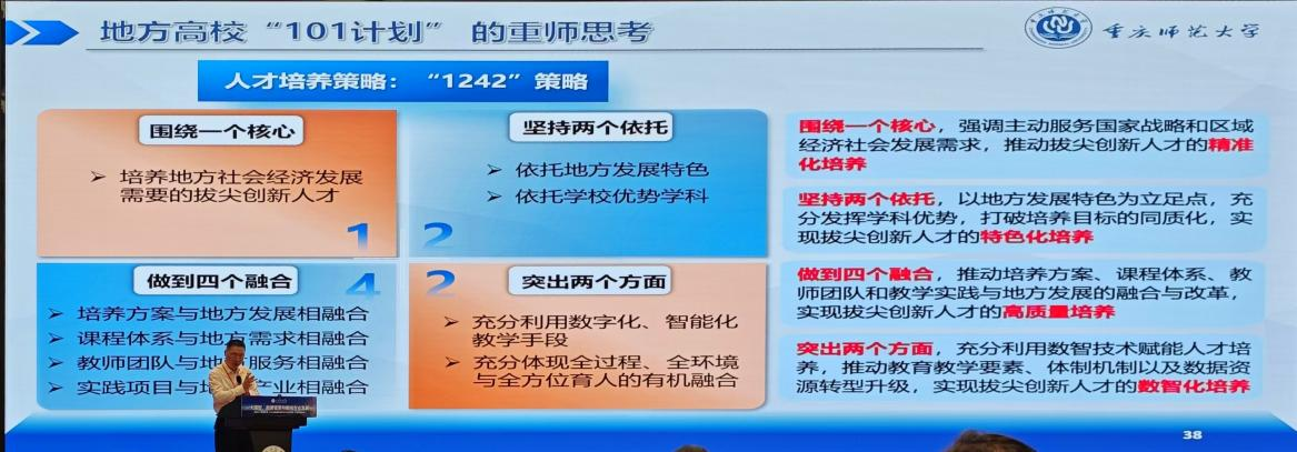 此外,王国胤还系统地梳理了新时代人才培养范式的演进逻辑—从信息化迈向数字化,再步入“数智化”阶段。他提出,应构建“师—生—机”三位一体的复合育人结构,利用生成式人工智能、虚拟人、教育机器人等智能代理,推动教学从灌输式向交互式、精准化转变。王国胤详细介绍了bat365在“1281”数字校园体系建设方面取得的阶段性成果,强调数字校园不仅是可视化展示工具,更是服务全体师生的智慧化工作与学习空间。他结合学校党代会提出的四大发展战略,深入剖析了地方高校在交叉融合、数字赋能和特色发展中的路径选择,分享了“101计划”,“1242策略”等改革试点实践,充分展现bat365在数智教育领域的理论引领力与实践创新力。
