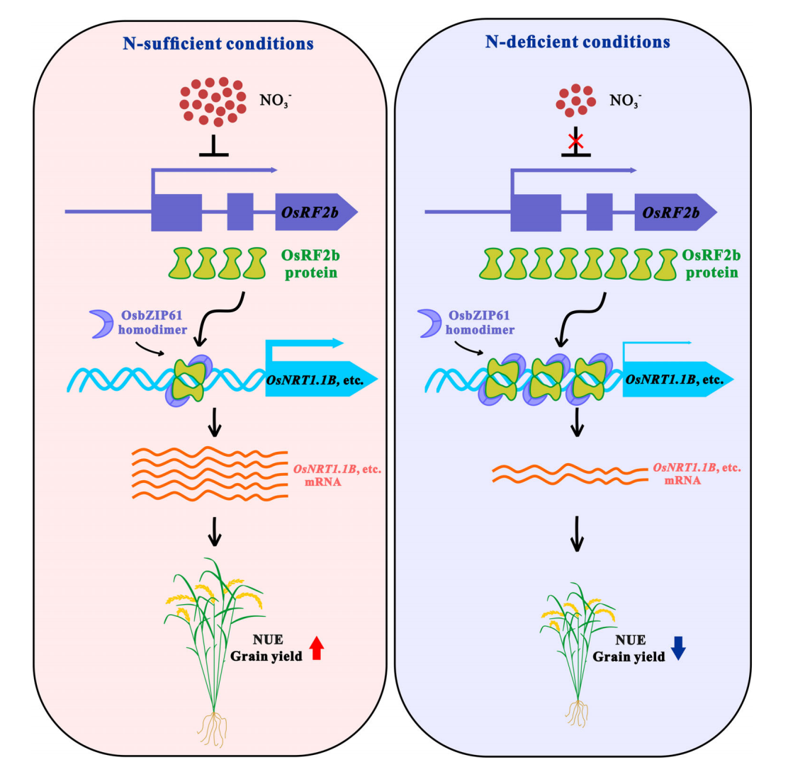 该课题组在前期研究中,首先鉴定到了水稻bZIP家族基因OsRF2b,该基因编码一个响应硝酸盐的核定位蛋白。通过对OsRF2b过表达株系的表型和农艺性状进行分析发现,OsRF2b过表达株系表现出生长缓慢和矮化表型,并通过降低氮素吸收和含量以及NUE来影响水稻的生长发育,最终导致籽粒变小和产量降低,而该基因敲除株系则呈现出相反表型。进一步研究发现OsRF2b能够直接调控硝酸盐转运关键基因OsNRT1.1B的表达,从而影响NUE及水稻最终产量的形成。此外,通过互作蛋白鉴定研究并发现OsRF2b与OsbZIP61存在相互作用,通过形成异源二聚体负调控OsNRT1.1B的表达共同参与NUE和产量调控。这一发现不仅拓展了bZIP家族转录因子OsRF2b与OsbZIP61模块参与氮营养调控的认知,也为培育氮高效水稻品种提供了基因资源,对开发具有更高NUE的作物并最终促进农业可持续发展具有重要价值。
