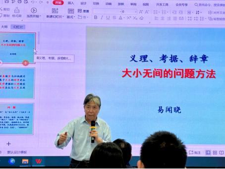 5月29日晚,文学院“精是讲堂”第140期在汇贤楼113会议厅举行。本期讲座邀请到了贵州师范大学学术委员会主任、博士生导师、教育部长江学者特聘教授、贵州省核心专家,享受国务院特殊津贴,兼任中国赋学会副会长、贵州省文联副主席易闻晓教授作题为《义理、考据、词章:大小无间的问题方法》的专题讲座。何易展教授担任主持,文学院部分教师及硕士研究生到场聆听。