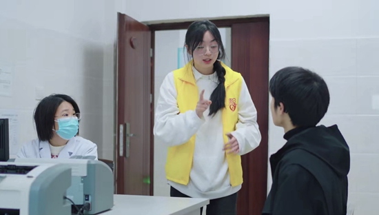 “融·趣”手语志愿服务团队的志愿者在医院为听障人士做服务。