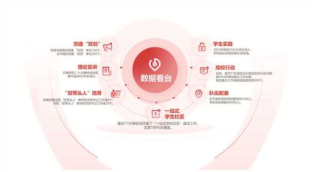 党建引领坚定“前行航向”,党建引擎激活“发展密码”。各高校充分运用新理念新方法新机制,推动党政业务体系重构、流程再造、制度重塑、能力变革。值得一提的是,我市按照“应建尽建、全面覆盖”的要求,推动全市高校开展“一站式”学生社区建设工作,其中西南政法大学通过强化党建统领,打造新时代学生楼栋育人共同体,构建“党组织+学生楼栋”的工作模式,打通育人“最后一公里”,努力实现学生工作“服务就在身边,问题不出楼栋”。