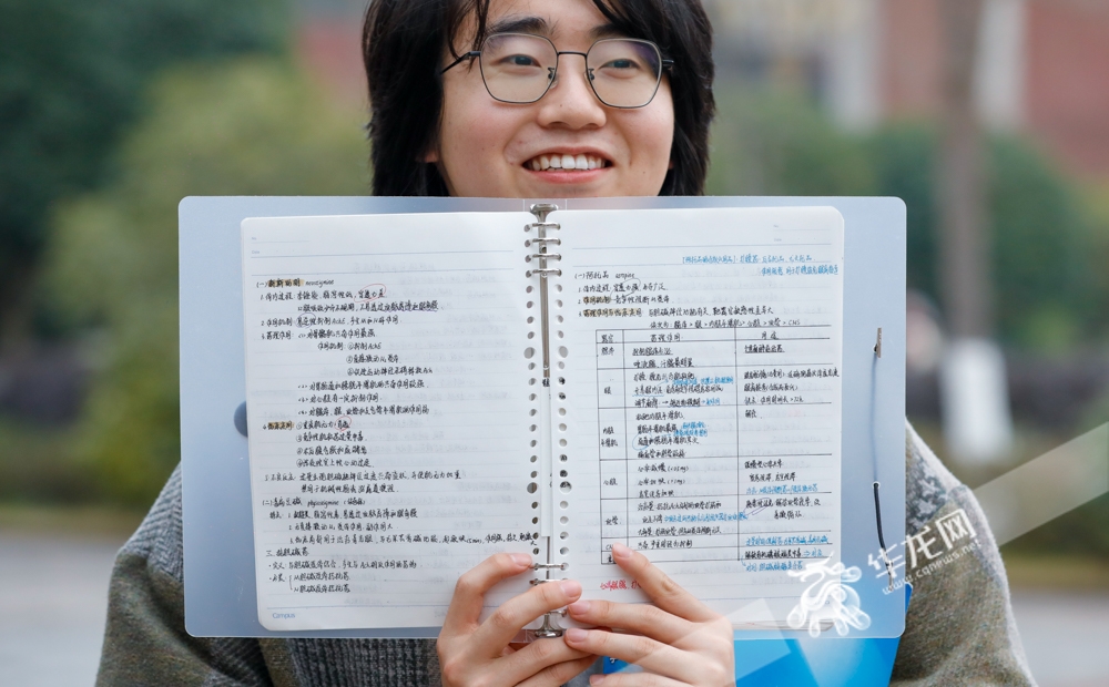 重庆医科大学2022级护理专业学生吴玲虽然嘴上这样开玩笑,复习起来却无比认真。她这学期她要考14门课程,为迅速突围,她从学姐那里借来这份“传承”多年的专业课笔记。