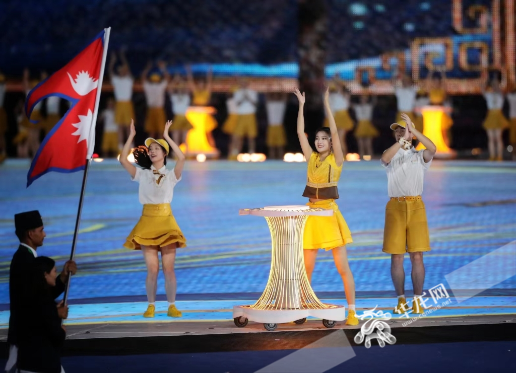 亚运会开幕式现场,一群敲着桂花鼓的表演者中,