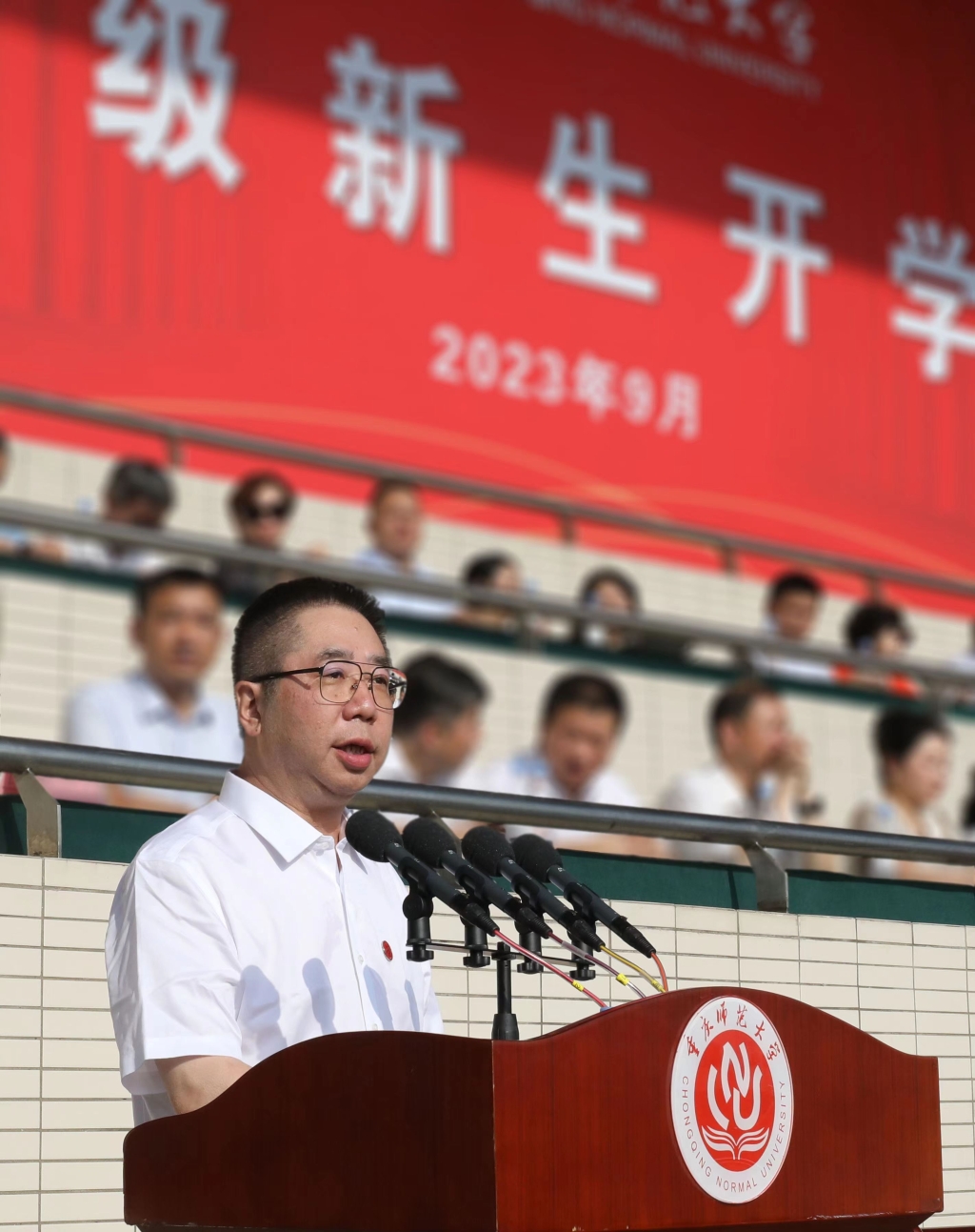 bat365官方官网2023级新生开学典礼和本科生军训动员大会现场。主办方供图“踏进校门,迎接我们的是便捷的校园巴士,拿到手里的是满含爱意的新生餐券;亲切的辅导员事无巨细地交待我报到的流程,热情的志愿者一定要拎过我手中的行李。”在新生代表发言时,2023级新闻与传媒学院黄玺菘回忆着自己入校时的场景,这一切都让她体会到身为重师人的幸福感。