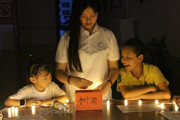 “关灯,看,是流星雨!”充满吸引力的活动主题、通俗的讲解、贴近生活的取材、讲述着最遥远的流星雨。通过实践团成员的讲解,小朋友从萤火虫为什么会发光一路探索到何为萤石,为何会散发萤光。利用维生素b2在白醋(乙酸)中为强荧光物质,在紫外线的照射下呈现淡绿荧光的化学特性开展实践课堂,用科普实验开拓小朋友的眼界,启发小朋友对化学的认知。